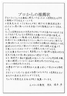 また、小笠原先生の凄いところは常に新たな治療法についての研究を継続している姿勢です。多忙な中での日々のこうした努力ごと確かな治療効果の持続といった結果につながっているのだと思います。さらに特筆すべきは小笠原先生の人柄です。これは技術以前に治療家にとって最も重要な要素です。